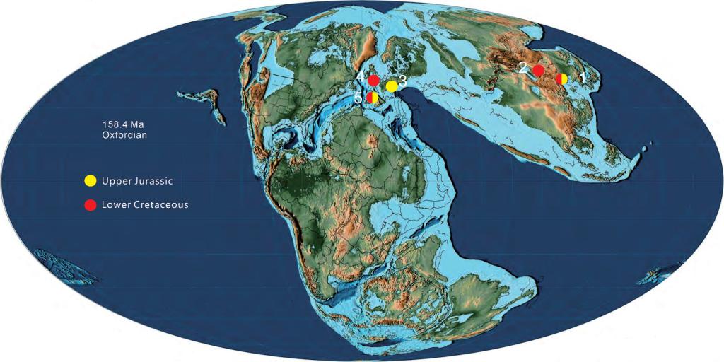 中国辽西和内蒙古东南部;2.蒙古戈壁沙漠;3.德国的拜仁、巴登-符腾堡、巴伐利亚和巴登-符腾堡;4.多塞特和英格兰的西苏塞克斯;5.西班牙的帕伦西亚