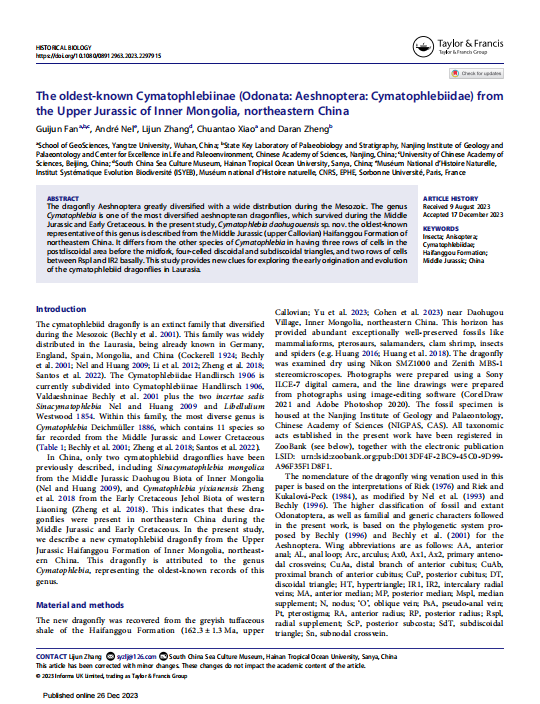 yl7703永利集团地质学专业硕士研究生范桂君同学在我院肖传桃教授、中科院南京地质古生物研究所郑大燃研究员的共同指导下,在地球科学与古生物学领域期刊《Historical Biology》上发表题为“The oldest-known Cymatophlebiinae (Odonata:Aeshnoptera: Cymatophlebiidae) from the UpperJurassic of Inner Mongolia, northeastern China”的研究论文。