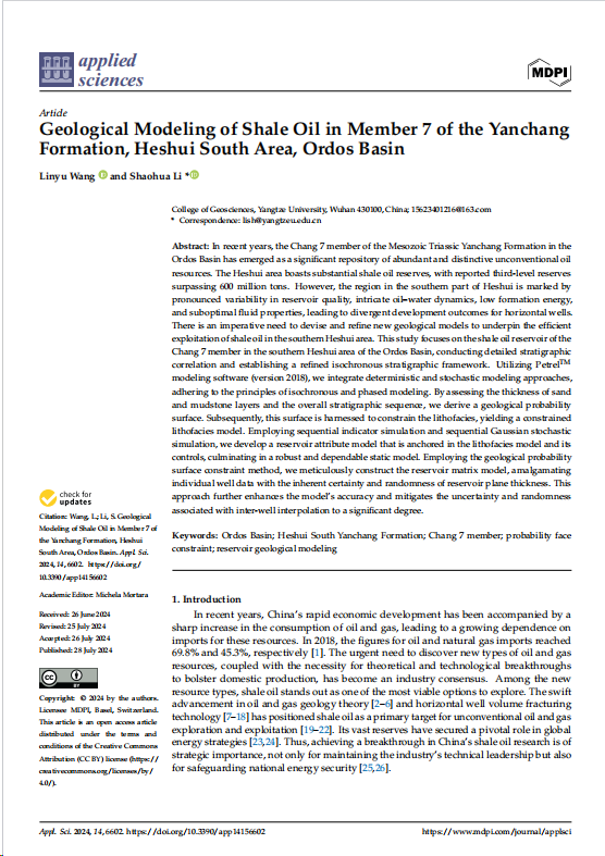 地科学院李少华教授团队长期从事储层表征与建模的研究,团队成员王麟宇在环境与地球科学领域主流期刊《Applied Sciences》上发表题为“Geological Modeling of Shale Oil in Member 7 of the YanchangFormation,Heshui South Area, Ordos Basin”的研究论文。