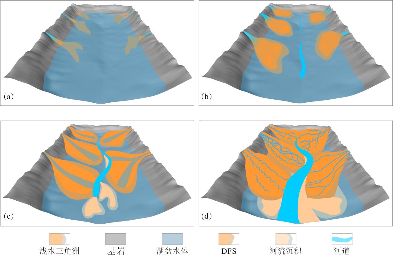 该研究首次将分支河流体系模式应用于多物源浅水湖盆的演化过程,通过水槽模拟实验,再现了狭长浅水湖盆沉积体系的沉积过程。研究表明:(1)随着DFS规模扩大,DFS 表面的水流逐渐聚集,初始流态为片流,随后演化为非限制性水流,最终为限制性水流;(2)随着盆地可容纳空间变小,盆地内的轴向水流逐渐汇聚成轴向河流,轴向河流对两侧的DFS产生破坏作用并不断决口,最终在盆地内轴向河流下游形成大规模的河道沉积;(3)狭长浅水湖盆发育多个DFS时,沉积砂体主要集中在物源附近的 DFS 处以及轴向河流下游,盆地发育时间越久,河流沉积规模越大。该研究从盆地尺度刻画了物源供给充足的狭长浅水湖盆沉积发育模式,明确了DFS和轴向河流砂体展布规律,为油气勘探和分支河流体系研究提供理论支持。