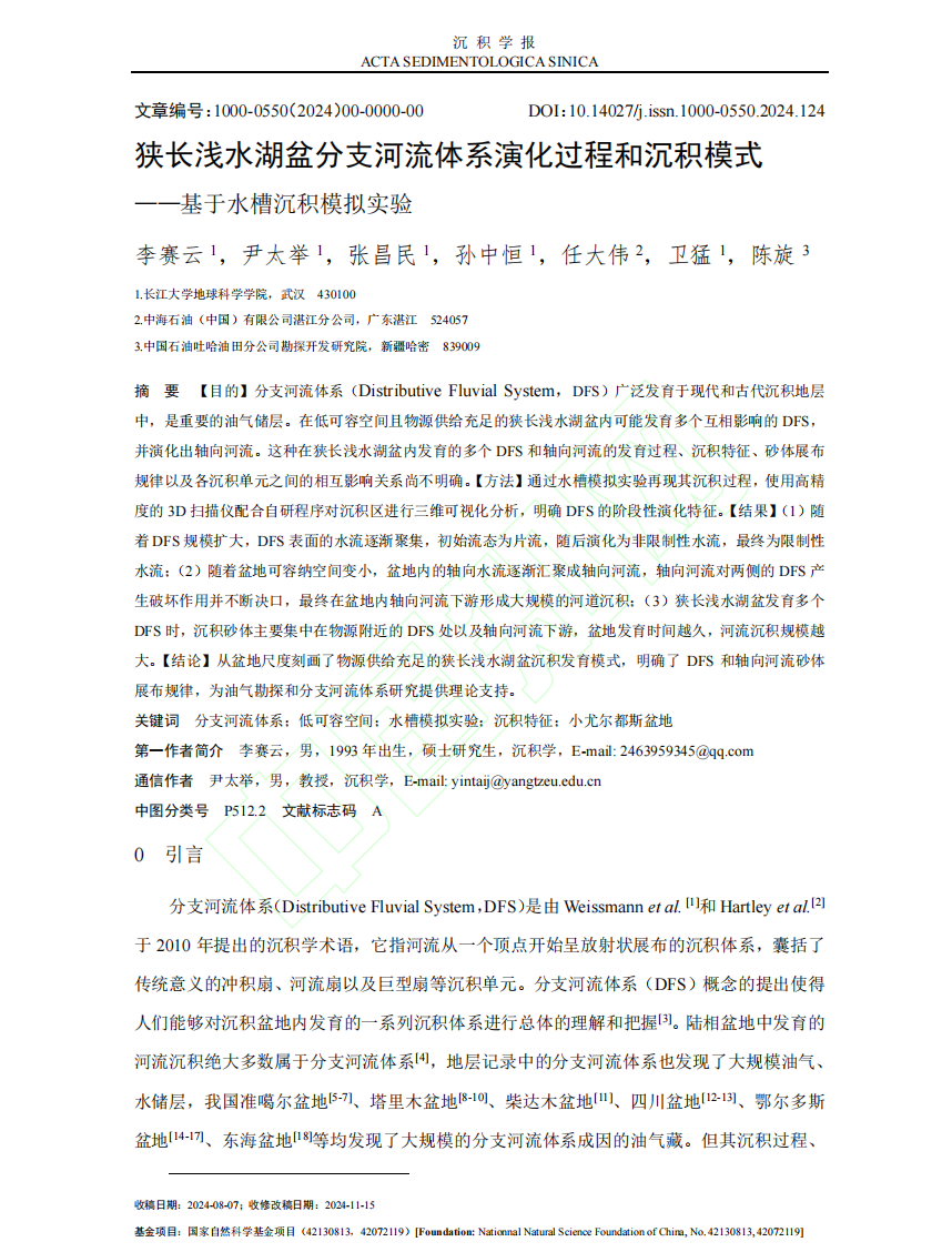 地科学院研究生李赛云在《沉积学报》上发表题为“狭长浅水湖盆分支河流体系演化过程和沉积模式——基于水槽沉积模拟实验”的研究论文。yl7703永利集团为论文第一署名单位,研究生李赛云为论文第一作者,其导师尹太举教授为通讯作者。