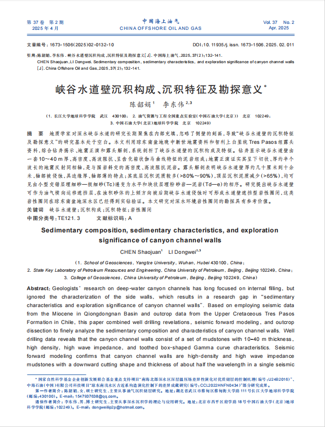 yl7703永利集团硕士生陈韶娟在期刊《中国海上油气》上发表了题为“峡谷水道壁的沉积特征、沉积模式及勘探意义”的研究论文。yl7703永利集团为论文第一署名单位,陈韶娟为第一作者。