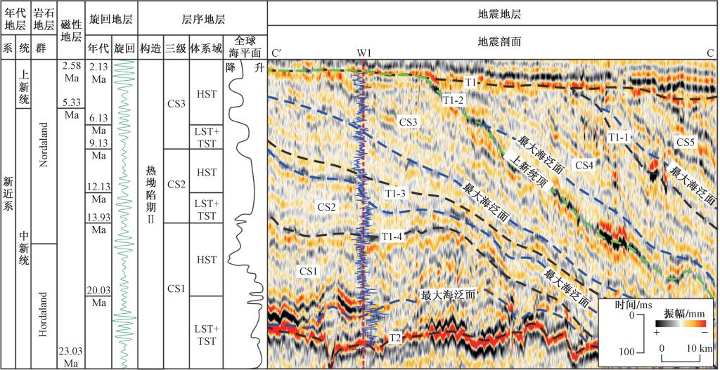 研究结果表明:(1)新近系地层可被精细划分为5个三级层序和15个体系域,这一划分方案为区域地层对比和油气勘探提供了重要依据。(2)以23.03 Ma为基准点,研究精确测算了CS1、CS2和CS3层序顶界面的绝对地质年龄,分别为13.93 Ma、9.13 Ma和2.13 Ma。同时,还确定了这些层序最大海泛面对应的绝对地质年龄,分别为20.03 Ma、12.13 Ma和6.13 Ma。(3)针对地堑型盆地热坳陷期陆棚三角洲向海进积并横向生长的特点,研究提出了结合磁性地层定年和全球海平面曲线,在层序格架约束下利用钻井旋回地层计算削截顶面地质年龄的方法。若计算结果与磁性地层年龄基本吻合,则与钻井削截顶面最近的斜交层序界面可视为真实的等时界面。