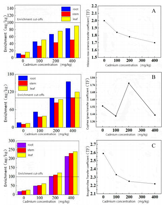 图2 三种开花植物在不同镉浓度下的富集系数和转移系数。