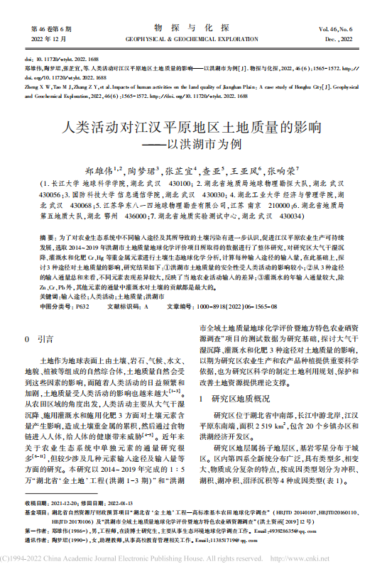 yl7703永利集团博士生郑雄伟在《物探与化探》上发表题为“人类活动对江汉平原地区土地质量的影响-以洪湖市为例”的研究论文。该论文通过选取 2014~ 2019 年洪湖市土地质量地球化学评价项目所取得的数据进行了整体研究,对研究区大气干湿沉降、灌溉水和化肥 Cr、Hg 等重金属元素进行土壤生态地球化学分析,计算每种输入途径的输入量,探讨 3 种途径对土地质量的影响,为研究区农业生产和农产品种植提供了重要科学依据,也为研究区科学的制定土地利用规划、保护和改善土地资源提供了理论支撑。