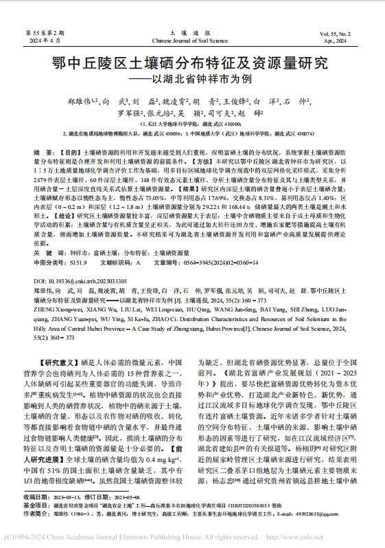 yl7703永利集团博士生郑雄伟在《土壤通报》上发表题为“鄂中丘陵区土壤硒分布特征及资源量研究−以湖北省钟祥市为例”的研究论文。该论文选取鄂中丘陵区湖北省钟祥市西北部地区为研究对象,采用多目标区域地球化学调查规范中所采用的双层网格化模式采样,测定包括硒在内的土壤各类元素等30项指标,通过单位土壤硒含量揭示土壤硒的分布特征、硒的来源及影响因素,对湖北省土壤硒资源开发利用和富硒产业高质量发展有着重要的实际意义。
