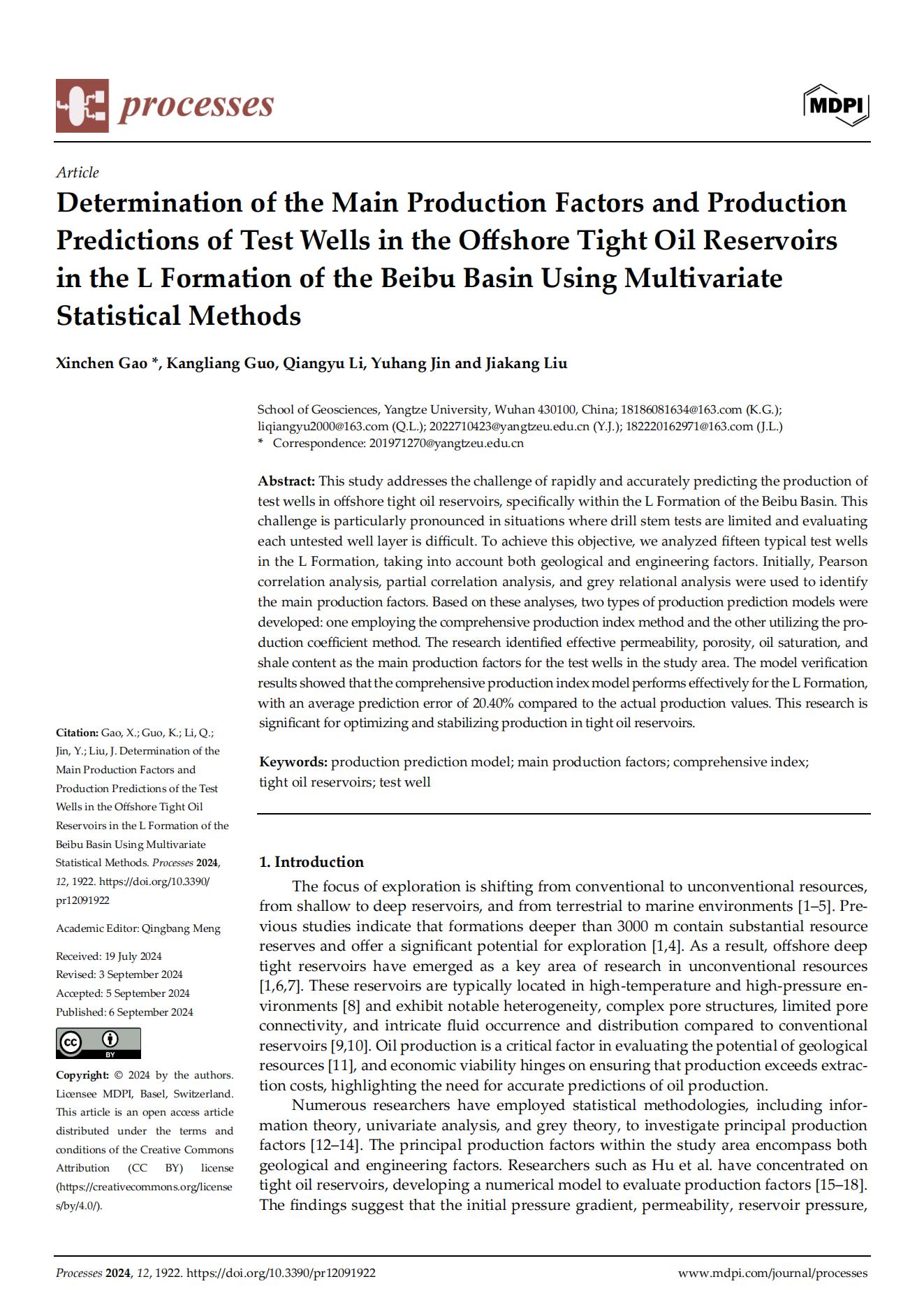 yl7703永利集团22级博士研究生在期刊《Processes》上发表题为“Determination of the Main Production Factors and Production Predictions of Test Wells in the Offshore Tight Oil Reservoirsin the L Formation of the Beibu Basin Using Multivariate Statistical Methods”的研究论文。yl7703永利集团为论文第一署名单位,高昕晨为第一通讯作者。