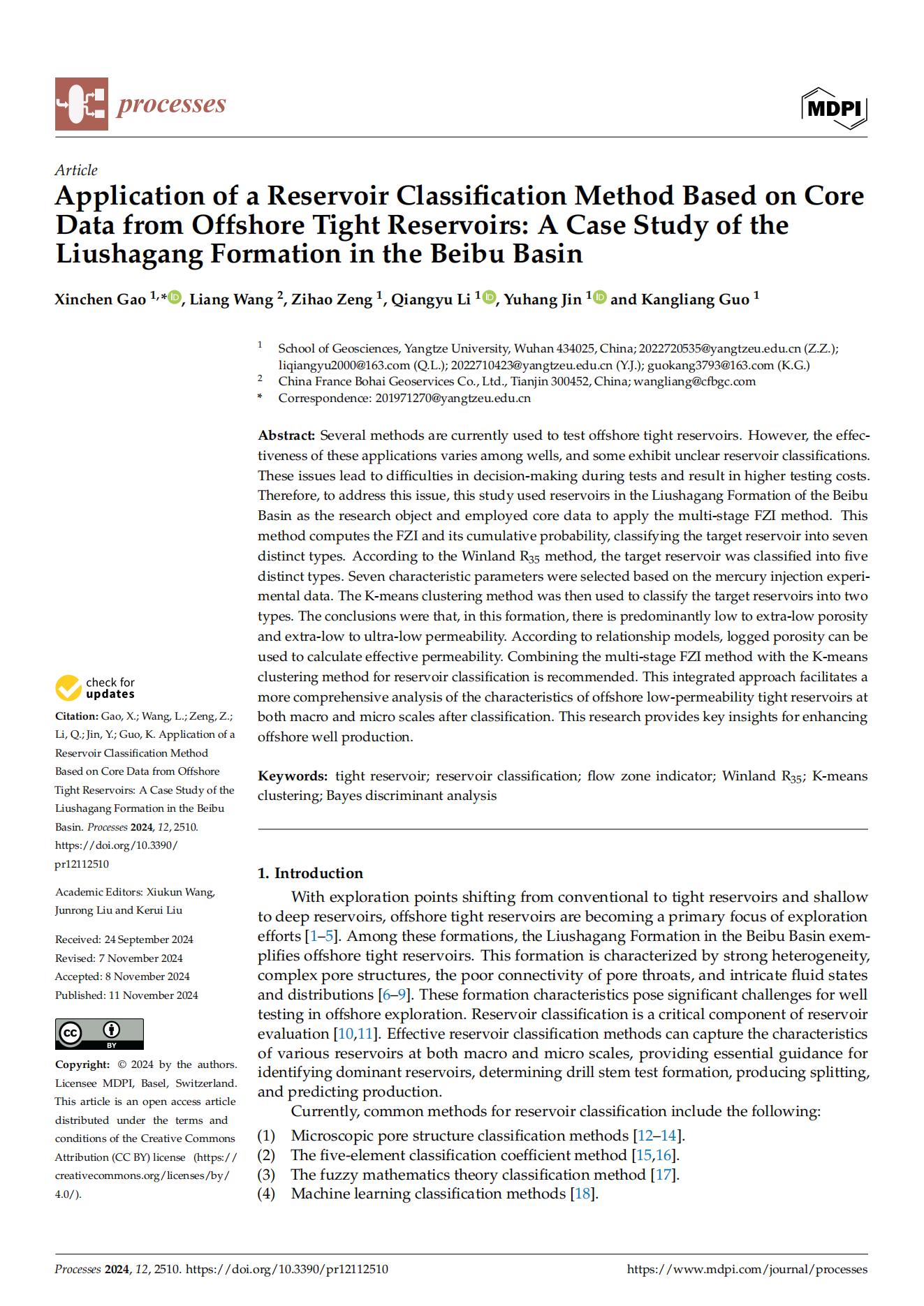 yl7703永利集团22级博士研究生在期刊《Processes》上发表题为“Application of a Reservoir Classification Method Based on CoreData from Offshore Tight Reservoirs: A Case Study of theLiushagang Formation in the Beibu Basin”的研究论文。yl7703永利集团为论文第一署名单位,高昕晨为第一通讯作者。
