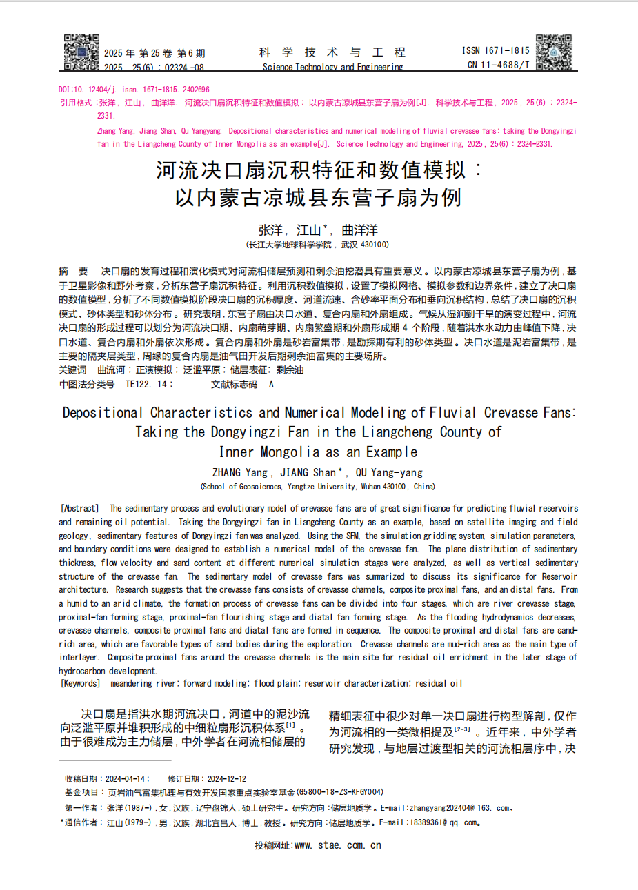近日,yl7703永利集团地质学专业2022级硕士生张洋在中文核心期刊《科学技术与工程》发表题为“河流决口扇沉积特征和数值模拟:以内蒙古凉城县东营子扇为例”的研究论文。yl7703永利集团为论文第一署名单位,硕士生张洋为论文第一作者,其导师江山教授为通讯作者。