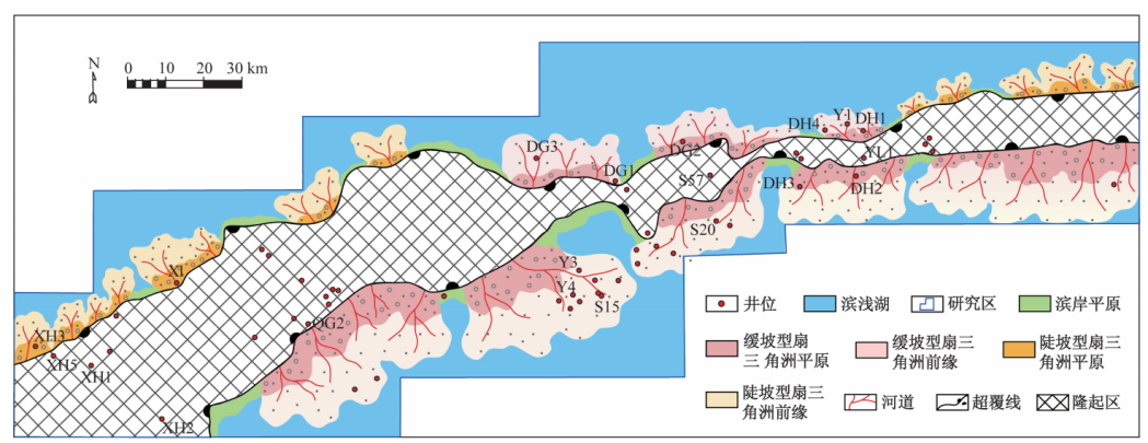 通过利用岩心、测井、三维地震等资料的方法,研究了塔里木盆地雅克拉断凸及周缘地区白垩系亚格列木组沉积相类型及空间展布特征,以源汇理论为指导分析物源区特征对扇三角洲的发育的控制作用。 结果表明:雅克拉断凸及周缘地区亚格列木组发育扇三角洲群沉积。 在亚格列木组沉积时期,雅克拉断凸地区的古隆起具有明显的分段性,呈北东东向的条带状隆起,呈现东、西两个凸起,中部地势低的特征。基于源-汇体系分析,明确扇三角洲群沉积物源来自古隆起风化剥蚀区域,多支古沟谷为扇三角洲群沉积提供了沉积物输送通道(图1)。 可见古地貌、沟谷发育特征等控制着雅克拉断凸及周缘地区亚格列木组源-汇体系,形成多物源供给的沉积格局,古隆起西段主要表现为高隆起、沟谷面积较大;东段主要表现为低隆起、沟谷面积较小。物源区沟谷的发育规模控制了古隆起周缘三角洲沉积展布规模。古隆起以南发育缓坡型扇三角洲沉积体系,以北发育陡坡型和缓坡型扇三角洲沉积体系(图2)。源-汇体系分析降低了亚格列木组沉积相研究的不确定性,可以为油气勘探提供更多地质依据。