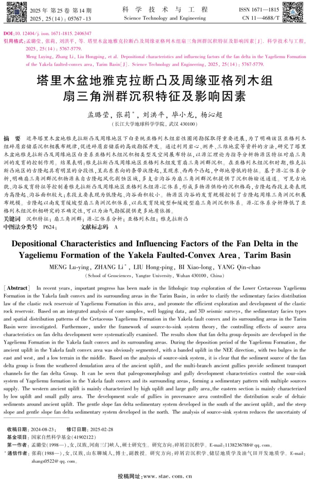 yl7703永利集团22级硕士研究生孟璐莹在期刊《科学技术与工程》上发表题为“塔里木盆地雅克拉断凸及周缘亚格列木组扇三角洲群沉积特征及影响因素”的研究论文。yl7703永利集团为论文第一署名单位,硕士研究生孟璐莹为论文第一作者,其导师张莉副教授为该文通讯作者。