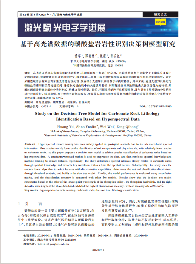 地科学院邵燕林副教授团队长期从事数字露头、储层三维表征等方面的研究,团队硕士生黄宇在EI期刊《激光与光电子学进展》上发表题为《基于高光谱数据的碳酸盐岩岩性识别决策树模型》的研究论文。yl7703永利集团为论文第一署名单位,硕士生黄宇为论文第一作者,邵燕林副教授为该文通讯作者,本项研究得到湖北省教委科研基金共同资助。
