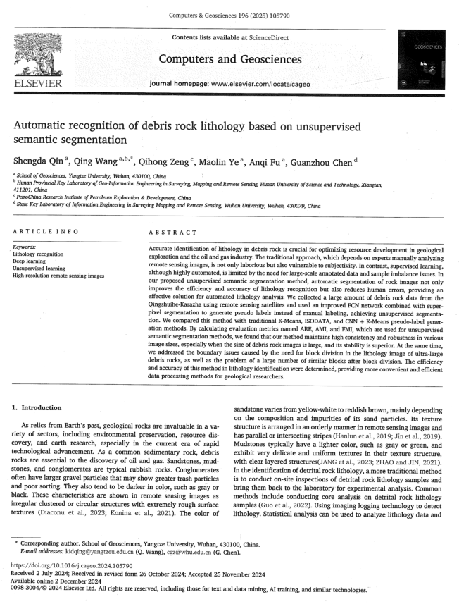 近日,yl7703永利集团测绘工程专业2025级硕士生秦声炟在SCI-2区期刊《Computers & Geosciences》发表题为“Automatic recognition of debris rock lithology based on unsupervised semantic segmentation”的研究论文。yl7703永利集团为论文第一署名单位,硕士生秦声炟为论文第一作者,其导师王庆副教授为通讯作者。