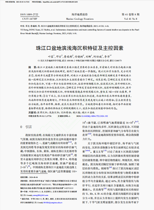 yl7703永利集团地质学专业2022级硕士研究生叶蓉在中文核心期刊《海洋地质前沿》发表题为“珠江口盆地滨浅海沉积特征及主控因素”的研究论文。yl7703永利集团为论文第一署名单位,硕士研究生叶蓉为论文第一作者,导师李华教授为通讯作者。