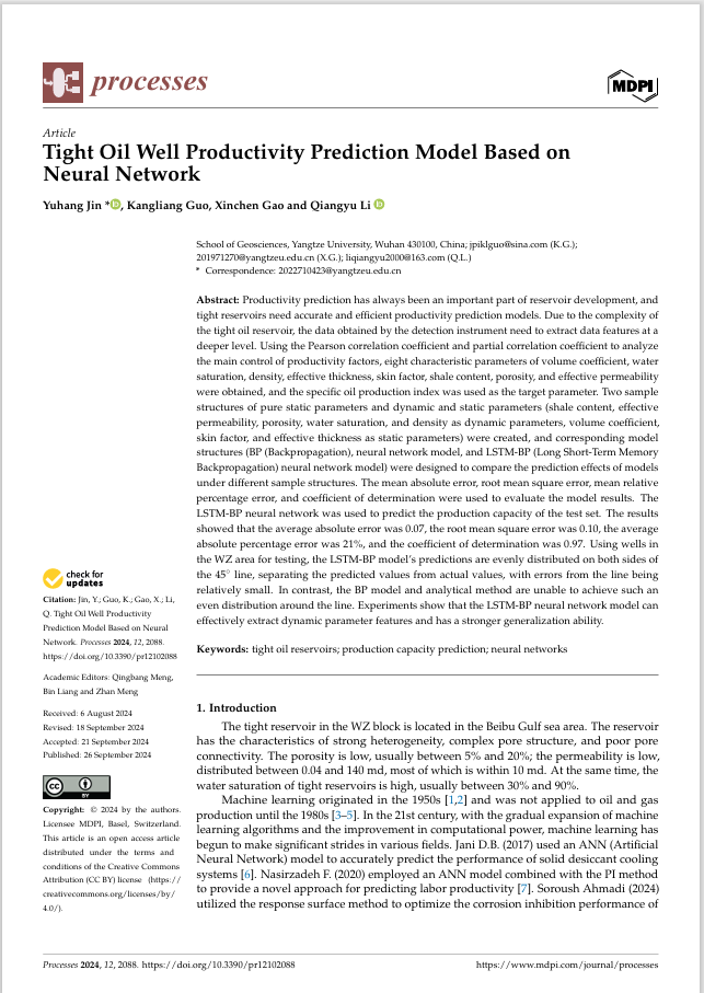近日,yl7703永利集团地质学专业2022级研究生金宇航在SCI三区期刊《Processes》(IF=2.8)发表题为"Tight Oil Well Productivity Prediction Model Based on Neural Network"的研究论文。yl7703永利集团为论文第一署名单位,研究生金宇航为论文第一作者,其导师郭康良教授为通讯作者。
