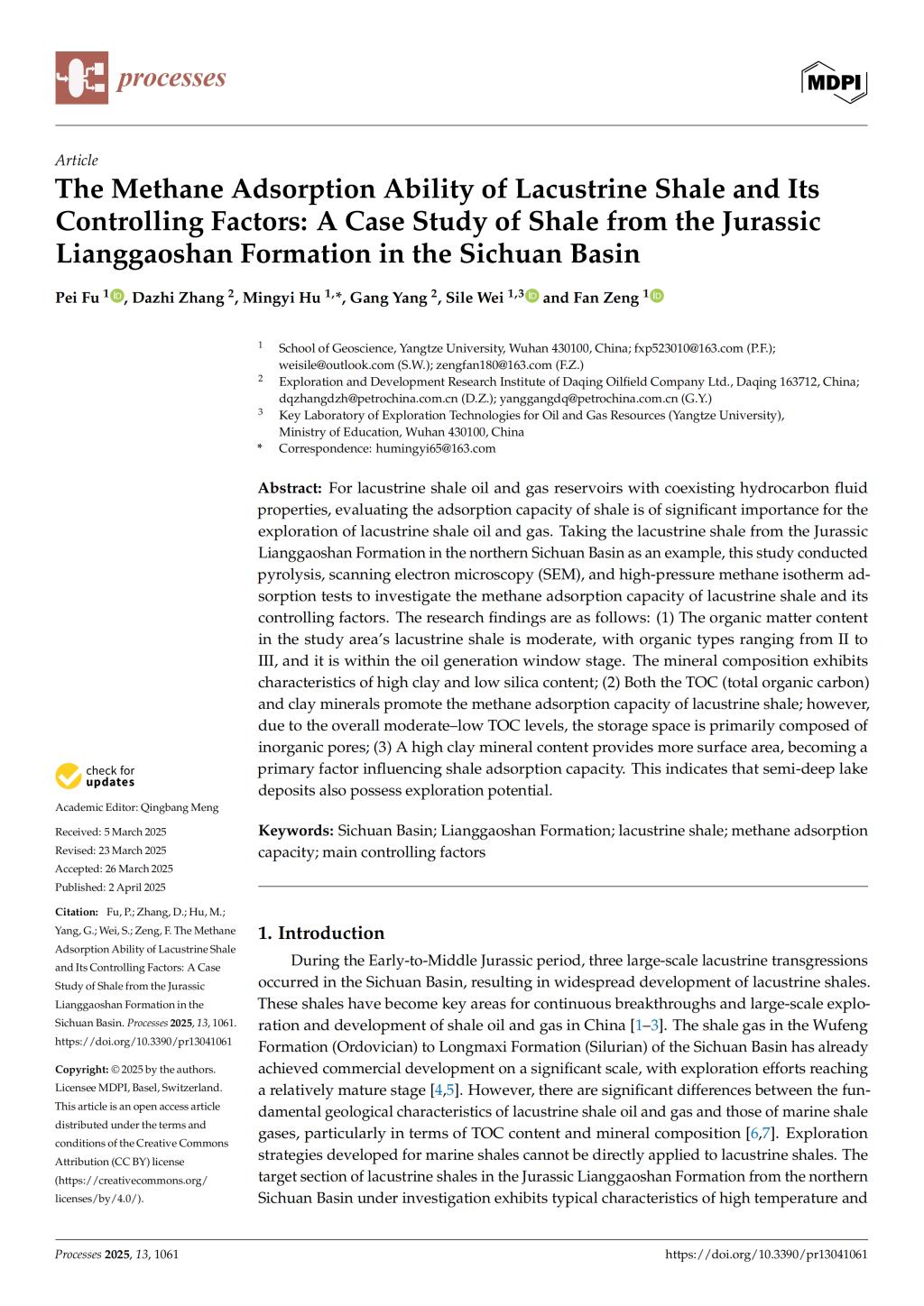 yl7703永利集团硕士生付沛在期刊《Processes》上发表了题为“The Methane Adsorption Ability of Lacustrine Shale and Its Controlling Factors: A Case Study of Shale from the Jurassic Lianggaoshan Formation in the Sichuan Basin”的研究论文。yl7703永利集团为论文第一署名单位,付沛为第一作者,其导师胡明毅教授为该文通讯作者。