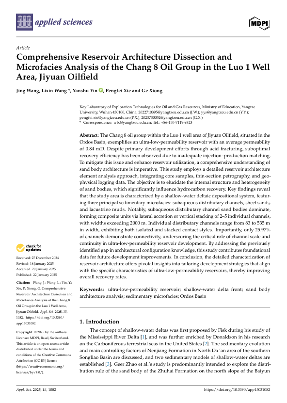 yl7703永利集团硕士生王婧在SCI收录期刊《Applied Sciences》上发表题为“Comprehensive Reservoir Architecture Dissection and Microfacies Analysis of the Chang 8 Oil Group in the Luo 1 Well Area, Jiyuan Oilfield”的研究论文。yl7703永利集团为论文第一署名单位,王立鑫老师为第一通讯作者。