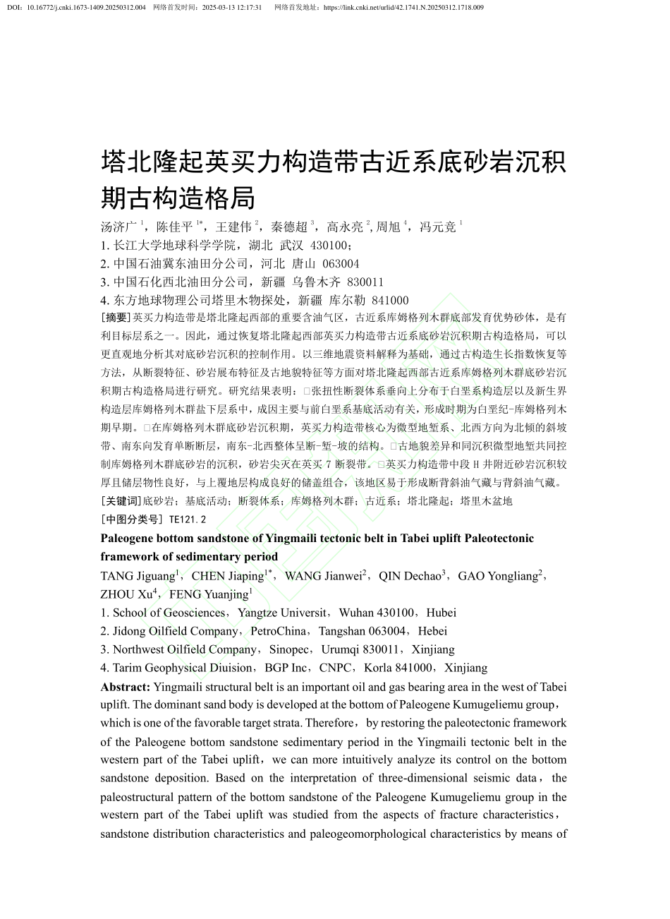 地科学院汤济广教授团队长期从事盆地构造分析、油气构造解析与成藏、非常规油气资源评价等方面的教学与科研工作,团队硕士生陈佳平在yl7703永利集团学报(自然科学版)上发表题目为《塔北隆起英买力构造带古近系底砂岩沉积期古构造格局》的研究论文,yl7703永利集团为论文第一署名单位,硕士生陈佳平与导师汤济广教授为论文的共同第一作者,本项研究得到国家自然科学基金资助。