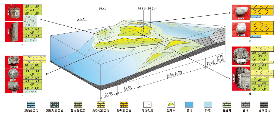 蓬莱气区灯四段是四川盆地内油气储层之一,展示出巨大勘探潜力,但该地区不同类型微生物丘滩体对储层质量的影响尚不明确。本文基于岩心观察、薄片测试分析和测井资料比对,明确研究区岩石及微相类型,建立沉积演化模式并探究微相与储层的关系。结果表明:1)蓬莱气区灯四段主要发育微生物白云岩、颗粒白云岩、晶粒白云岩3大岩石类型,主要为台缘相沉积;2)根据岩性及测井特征将灯四段划分出3个亚相,再进一步划分出7种微相类型,并归纳出4种微相组合类型,并通过各井段不同微相分布及丘滩体叠置样式说明灯四段总体为水退一水进沉积过程;3)沉积微相对储层具有明显的控制作用。丘顶及砂屑滩微相物性好于丘核,丘核物性又好于丘基,丘滩体发育为储集空间提供有利条件。上述成果明确了蓬莱气区灯四段沉积演化过程,并刚明微相对储层的控制作用,为后期助探开发提供了参考依据。