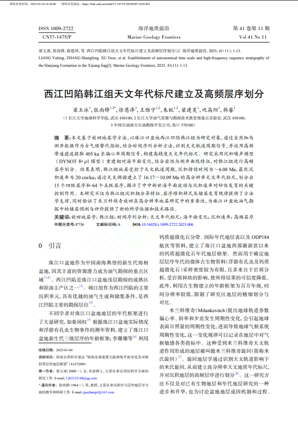 yl7703永利集团硕士生梁玉冰在《海洋地质前沿》发表题为“西江凹陷韩江组天文年代标尺建立及高频层序划分”的研究论文。yl7703永利集团为论文第一署名单位,通讯作者为张尚锋教授。