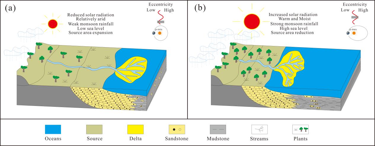 本研究以南海珠江口盆地恩平凹陷珠江组上段为研究对象,深入探讨天文轨道周期对古气候、海平面波动以及沉积发育的驱动机制。通过旋回地层学方法,结合自然伽马测井数据、地球化学参数(如化学蚀变指数CIA、氧化铝Al₂O₃含量等)以及沉积噪声模型(DYNOT和ρ1),对研究区进行了高分辨率时间序列分析。研究结果表明:(1)成功识别出405 kyr长偏心率、100 kyr短偏心率、40 kyr斜率及20 kyr岁差周期,并基于这些周期构建了15.98–19.09 Ma的高精度天文年代标尺;(2)海平面变化与405 kyr长偏心率周期显著同步,长偏心率高值期对应温暖湿润气候与海平面上升,沉积物以细粒泥岩为主;而低值期则为干热气候与海退,沉积物以粗粒砂岩为主;(3)地球化学参数验证了气候-海平面-物源的协同作用,揭示了天文轨道周期通过调控岁差振幅影响气候变化,进而控制沉积物类型与分布。本研究为天文轨道周期驱动下沉积储层预测提供了理论支撑,对南海深层油气勘探具有重要的理论和实践意义。