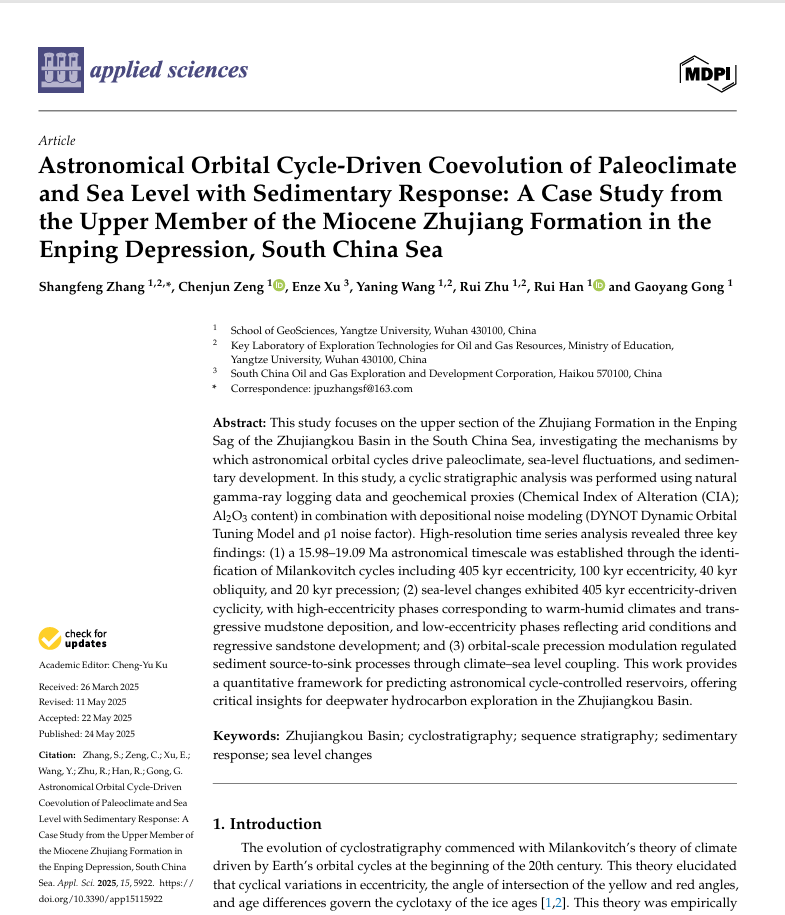 yl7703永利集团张尚锋教授在《Applied sciences》上发表题为“Astronomical Orbital Cycle-Driven Coevolution of Paleoclimate and Sea Level with Sedimentary Response: A Case Study from the Upper Member of the Miocene Zhujiang Formation in the Enping Depression, South China Sea”的研究论文。yl7703永利集团为论文第一署名单位,张尚锋教授为论文第一作者,硕士生曾晨峻为该文第二作者。该项研究得到国家自然科学基金“南海北部宽缓大陆架海平面变化及双坡折带层序地层模型”的资助。