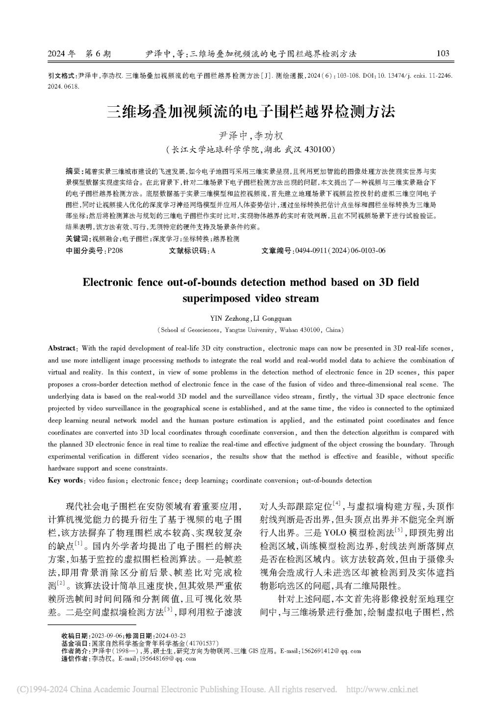 yl7703永利集团李功权课题组硕士生尹泽中在《测绘通报》上发表题为“三维场叠加视频流的电子围栏越界检测方法”的研究论文。
