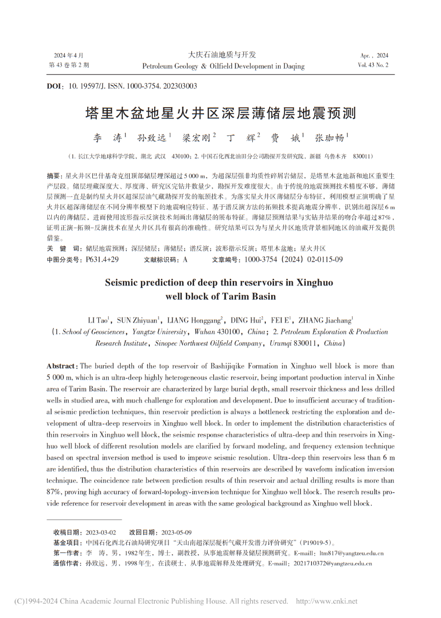 地科学院研究生孙致远以通讯作者身份在北大核心期刊《大庆石油地质与开发》上发表题为“塔里木盆地星火井区深层薄储层地震预测”的研究论文,yl7703永利集团为论文第一署名单位。副教授李涛为第一作者,研究生孙致远为论文通讯作者。