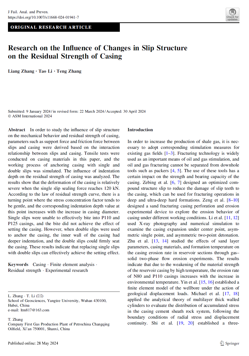 地科学院研究生张亮以通讯作者身份在EI期刊《Journal of Failure Analysis and Prevention》上发表题为“Research on the Influence of Changes in Slip Structure on the Residual Strength of Casing”的研究论文,yl7703永利集团为论文第一署名单位,研究生张亮为第一作者,副教授李涛为论文通讯作者。