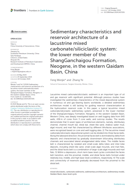 yl7703永利集团教师冯文杰在《Frontiers in Earth Science》上发表题为“Sedimentary characteristics and reservoir architecture of a lacustrine mixed carbonate/siliciclastic system: the lower member of the ShangGanchaigou Formation, Neogene, in the western Qaidam Basin, China”的研究论文。该论文针对柴达木盆地西部地区新近系上干柴沟组下段混积体系开展野外露头无人机倾斜摄影建模与解剖、地下储层表征,明确了油田开发尺度下,混积体系沉积特征与沉积模式。