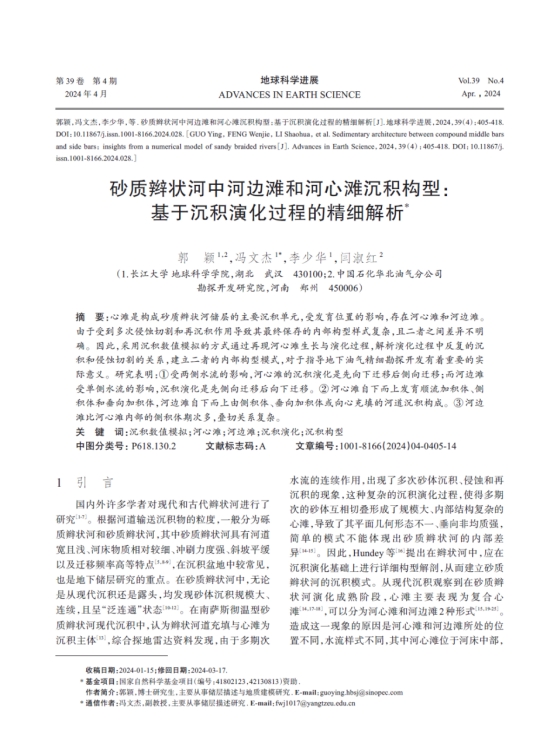 yl7703永利集团博士生郭颖在《地球科学进展》上发表题为“砂质辫状河中河边滩和河心滩沉积构型:基于沉积演化过程的精细解析”的研究论文。该论文采用沉积数值模拟的方式通过再现河心滩生长与演化过程,解析演化过程中反复的沉积和侵蚀切割的关系,建立二者的内部构型模式,对于指导地下油气精细勘探开发有着重要的实际意义。