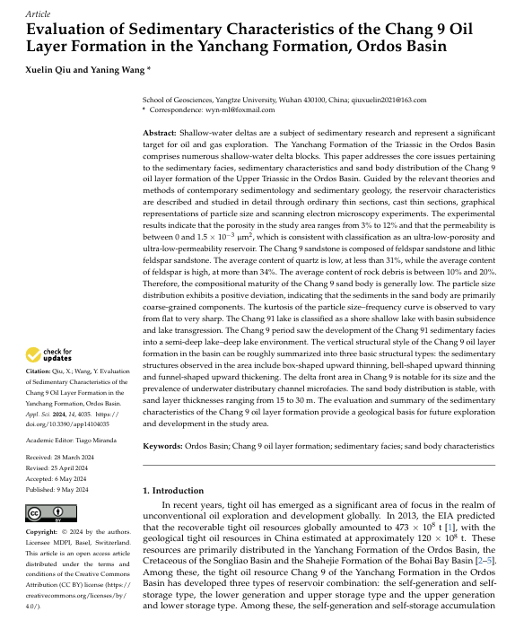 地科学院硕士生邱雪林在Applied Sciences-Basel发表题为“Evaluation of Sedimentary Characteristics of the Chang 9 Oil Layer Formation in the Yanchang Formation, Ordos Basin”的研究论文,通讯作者为王雅宁副教授。