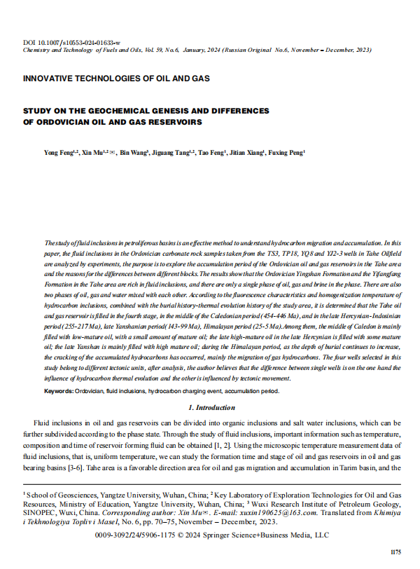 地科学院研究生母鑫以通讯作者身份在《CHEMISTRY AND TECHNOLOGY OF FUELS AND OILS》上发表题为“Study on the Geochemical Genesis and Differences of Ordovician Oil and Gas Reservoirs”的研究论文。对含油气盆地流体包裹体的研究,是认识油气运移和成藏的有效方法。文章通过实验对塔河油田TS3井、TP18井、YQ8井和YJ2-3井随钻取出的奥陶系碳酸盐岩地层样品中的流体包裹体进行分析,旨在探究塔河地区奥陶系油气藏的成藏期次及不同区块之间存在差异的原因。结果表明:塔河地区奥陶系鹰山组和一间房组地层流体包裹体种类丰富,相态上既有油、气、盐水单一相,同样存在油、气、水的两相或多相。根据烃类包裹体的荧光特性和均一温度,结合研究区的埋藏史-热演化史分析确定出塔河油田油气藏为4期充注,分别是加里东中期(454-446Ma)、海西晚期-印支期(255-217Ma)、燕山晚期(143-99Ma)、喜马拉雅期(25-5Ma)。其中加里东中期主要为低熟油充注,夹少量成熟油;海西晚期主要高熟油,夹部分成熟油的充注;燕山晚期主要是高熟油的充注;喜马拉雅期随着埋深的不断增加,发生油气藏的裂解,主要是气烃的活动。本次研究所选的4口井属于不同的构造单元,经过分析笔者认为单井之间的差异一方面是烃类热演化程度的影响,另一方面是受构造运动的影响。