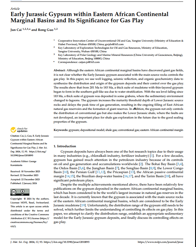 地科学院蔡俊副教授在《JMSE》上发表题为“Early Jurassic Gypsum within Eastern African Continental Marginal Basins and Its Significance for Gas Play”的研究论文。该研究通过基于钻测井和地震资料,结合地球化学数据,分析了转换型陆缘盆地膏盐岩分布特征、成因及其对油气分布的控制作用。研究结果显示在陆间裂谷期的海平面上升阶段,由于水体较深出现盐度分层作用导致薄层膏盐岩析出;随着海平面下降,在地堑控制的洼地形成潟湖环境,蒸发作用的加剧导致了厚层膏盐岩的形成。膏盐岩的发育提升了前转换期烃源岩成熟的阈值,导致大规模生排烃的迟滞,这或许是转换陆缘盆地巨型油气藏形成的重要原因之一。