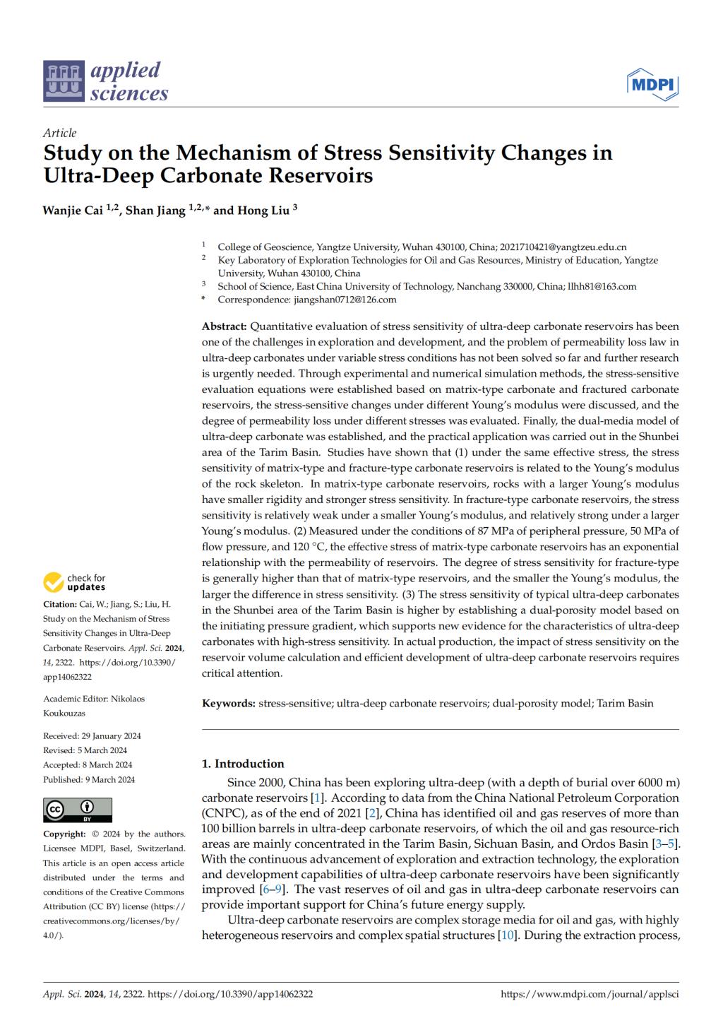 地科学院硕士生蔡万杰在《Applied sciences》发表题为“Study on the Mechanism of Stress Sensitivity Changes inUltra-Deep Carbonate Reservoirs”的研究论文。yl7703永利集团为论文第一署名单位,硕士生蔡万杰为论文第一作者,教师江山为通讯作者。