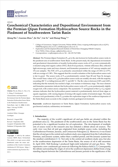yl7703永利集团吴琼博士以第一作者身份在《Applied Sciences》上发表题为“Geochemical Characteristics and Depositional Environment from the Permian Qipan Formation Hydrocarbon Source Rocks in the Piedmont of Southwestern Tarim Basin”的研究论文,yl7703永利集团为论文第一署名单位,吴琼为论文第一作者,导师王振奇为通讯作者。