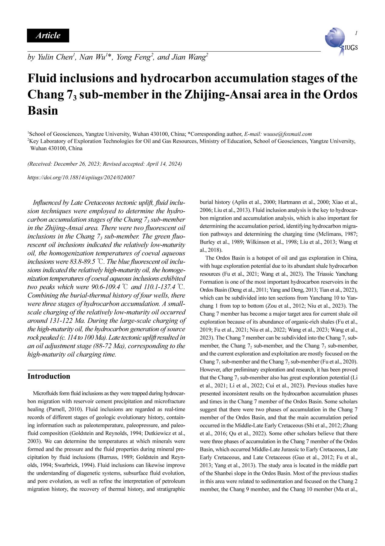 地科学院硕士生陈雨霖在《EPISODES》上发表题为“Fluid inclusions and hydrocarbon accumulation stages of the Chang 73 sub-member in the Zhijing-Ansai area in the Ordos Basin”的研究论文。yl7703永利集团为论文第一署名单位,硕士生陈雨霖为论文第一作者,教师吴楠为通讯作者。