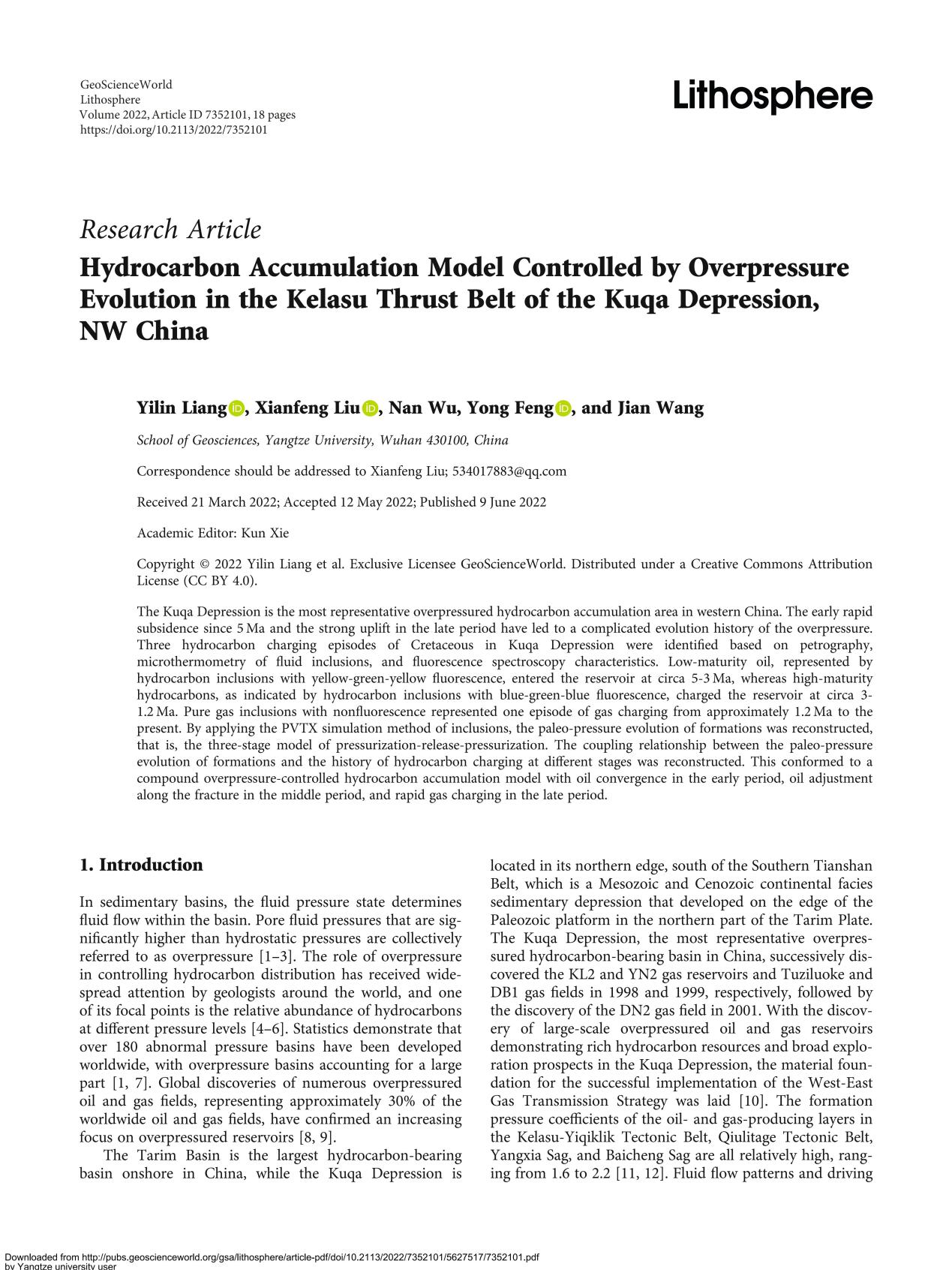 地科学院博士生梁祎琳在《LITHOSPHERE》上发表题为“Hydrocarbon Accumulation Model Controlled by Overpressure Evolution in the Kelasu Thrust Belt of the Kuqa Depression, NW China”的研究论文。yl7703永利集团为论文第一署名单位,博士生梁祎琳为论文第一作者,教师刘显凤为通讯作者。
