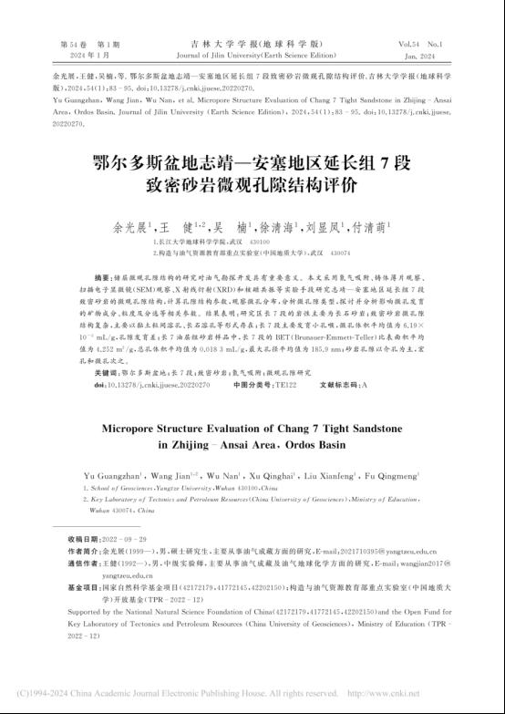 地科学院硕士生余光展在《吉林大学学报(地球科学版)》上发表题为“鄂尔多斯盆地志靖—安塞地区延长组7段致密砂岩微观孔隙结构评价”的研究论文。yl7703永利集团为论文第一署名单位,硕士生余光展为论文第一作者,教师王健为通讯作者。