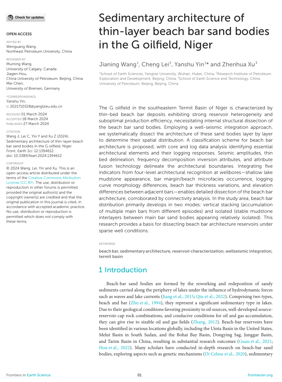 地科学院硕士研究生王嘉宁在《Frontiers in Earth Science》上发表题目为“Sedimentary architecture of thin-layer beach bar sand bodies in the G oilfield, Niger”的研究论文。yl7703永利集团为论文的第一署名单位,王嘉宁为论文的第一作者,尹艳树教授为通讯作者。