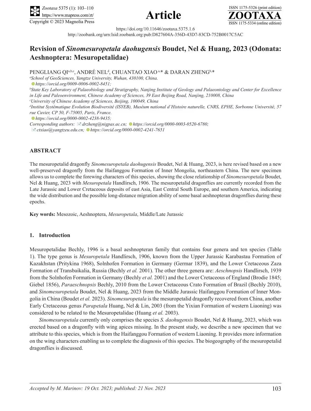 yl7703永利集团地质资源与地质工程专业硕士生漆鹏亮在古生物学期刊《ZOOTAXA》上发表题为“Revision of Sinomesuropetala daohugensis Boudet, Nel & Huang, 2023 (Odonata:Aeshnoptera: Mesuropetalidae)”的研究论文。yl7703永利集团为论文第一署名单位,漆鹏亮为第一作者,其导师肖传桃教授为第一通讯作者。
