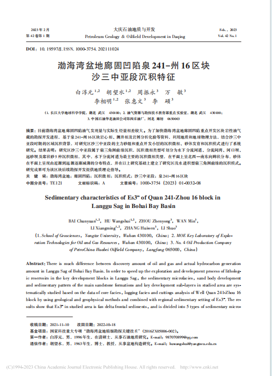 yl7703永利集团研究生白淳元在期刊《大庆石油地质与开发》上发表题目为“渤海湾盆地廊固凹陷泉241−州16区块沙三中亚段沉积特征”的研究论文。yl7703永利集团为论文第一署名单位,胡望水教授为通讯作者,本项研究得到国家科技重大专项“渤海湾盆地精细勘探关键技术资助。