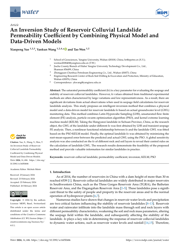 yl7703永利集团王艳昆副教授以通讯作者身份在SCI期刊《Water》上发表题为“An Inversion Study of Reservoir Colluvial Landslide Permeability Coefficient by Combining Physical Model and Data-Driven Models”的研究论文,该项研究得到了国家自然科学基金、湖北省自然科学基金和西藏自治区科技厅项目的共同资助。