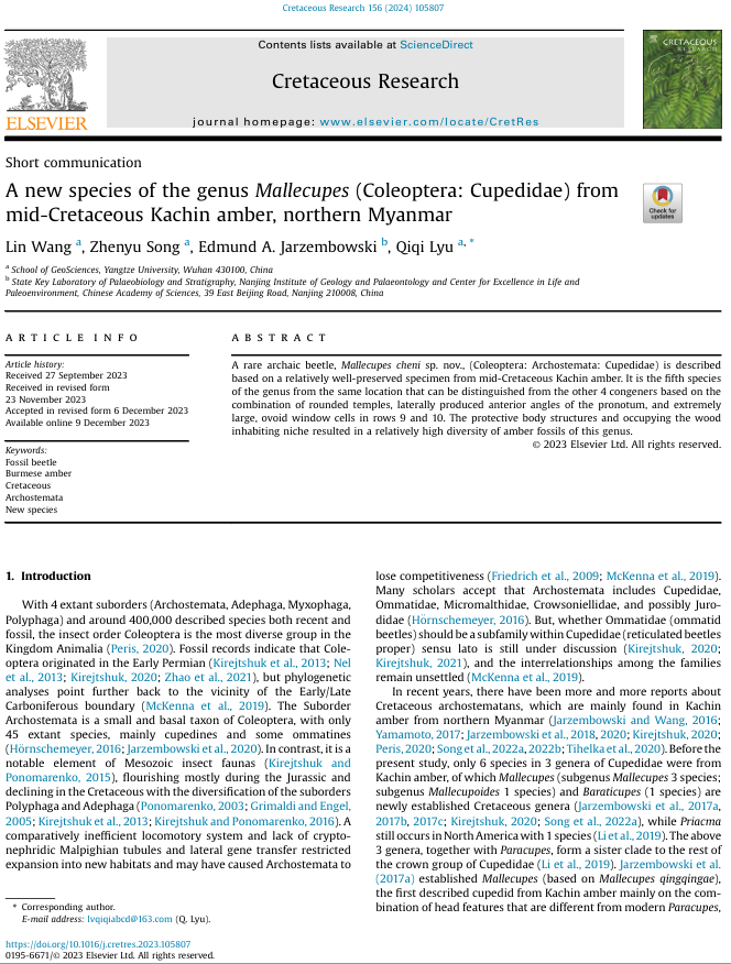 地科学院硕士研究生王林同学在我院吕奇奇、宋振宇两位老师共同指导下,在地球科学与古生物学领域期刊《Cretaceous Research》上发表题为“A new species of the genusMallecupes(Coleoptera: Cupedidae) from mid-Cretaceous Kachin amber, northern Myanmar”的研究论文。