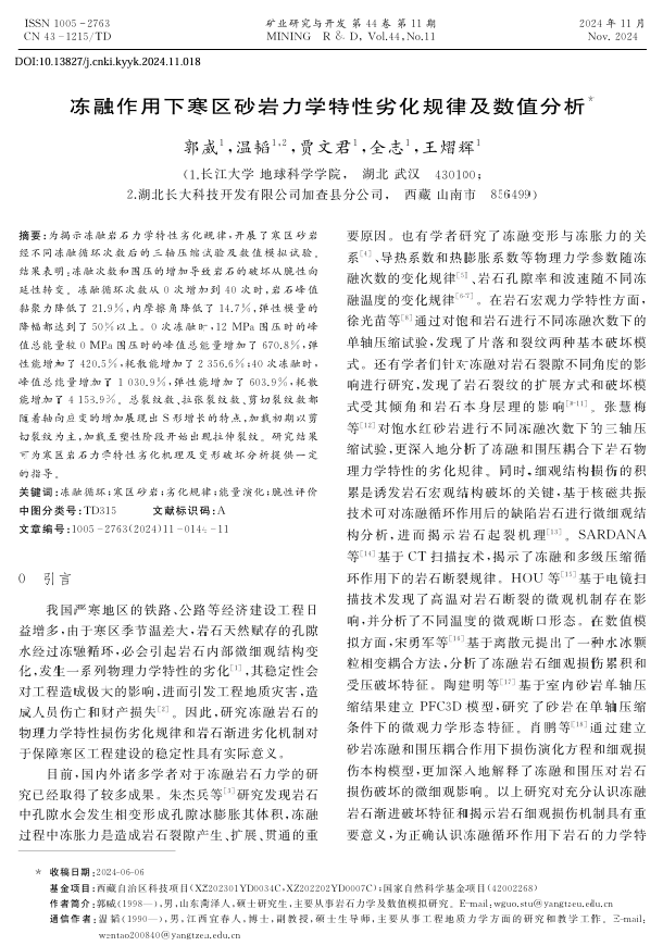 地科学院温韬教授团队长期从事冻融岩石力学、滑坡演化机理及预测与防治、岩土体稳定性评价与数值模拟、岩石力学特性表征、机器学习等方面的研究,团队硕士生郭威在核心期刊《矿业研究与开发》上发表题为《冻融作用下寒区砂岩力学特性劣化规律及数值分析》的研究论文。yl7703永利集团为论文第一署名单位,硕士生郭威为论文第一作者,温韬教授为该文通讯作者,本项研究得到西藏自治区科技项目和国家自然科学基金项目共同资助。