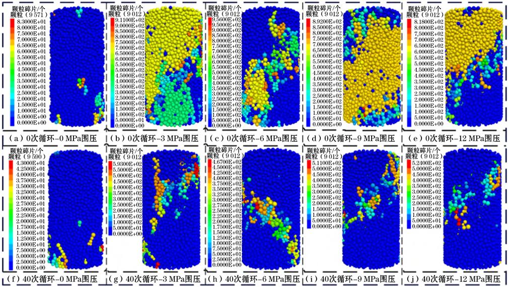 图3 0次和40次冻融循环时不同围压下岩样破裂特征