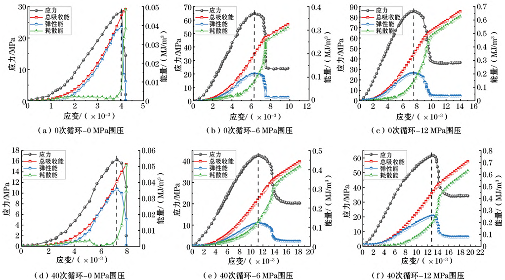图2 0次和40次冻融循环时不同围压下能量变化规律