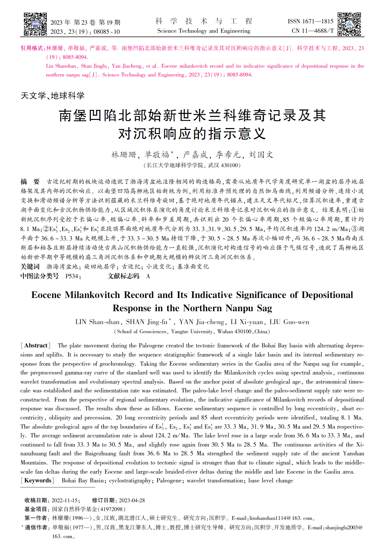 地科学院硕士生林珊珊在《科学技术与工程》发表题为“南堡凹陷北部始新世米兰科维奇记录及其对沉积响应的指示意义”的研究论文。yl7703永利集团为论文第一署名单位,硕士生林珊珊为论文第一作者,教师单敬福为通讯作者。