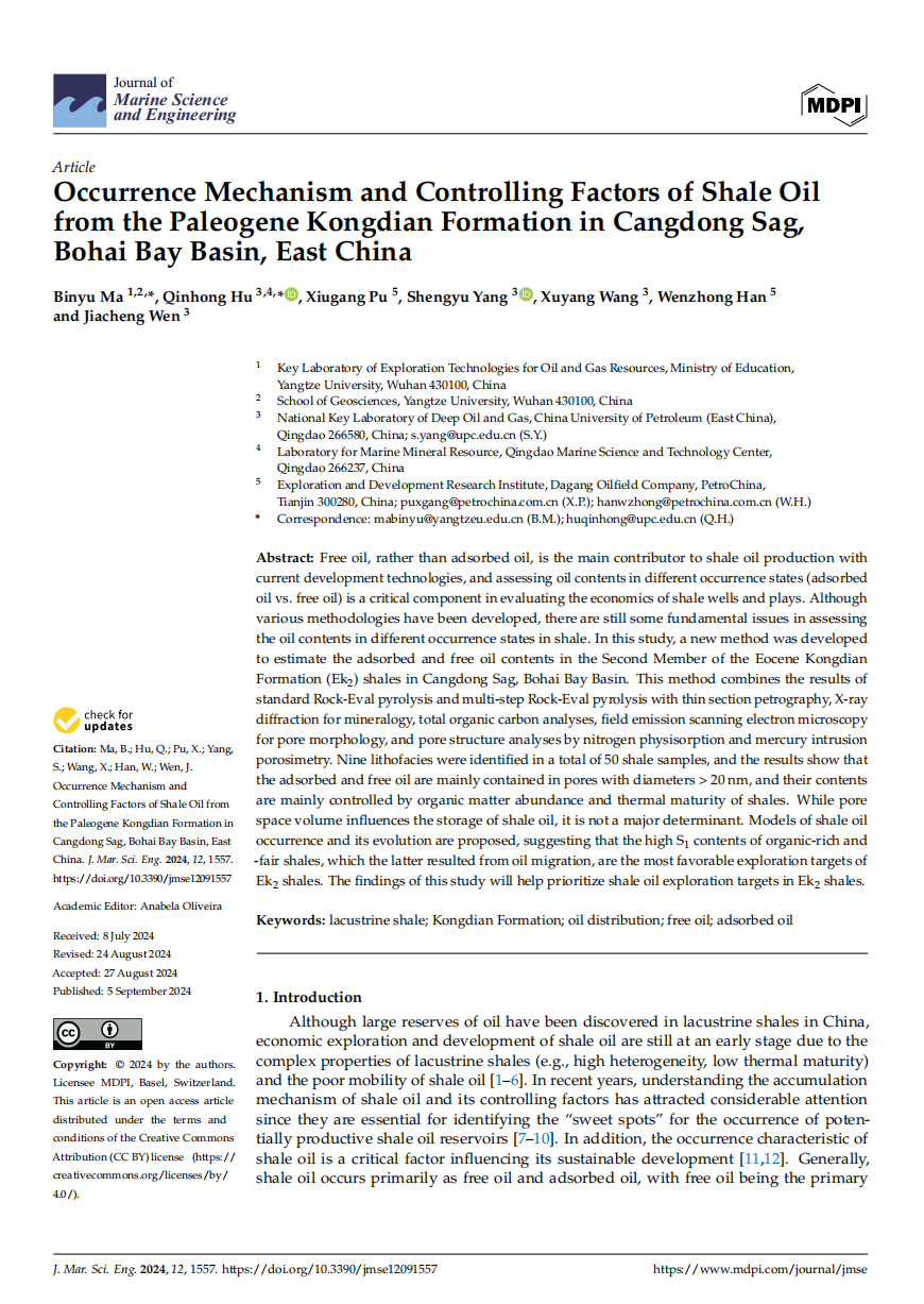 yl7703永利集团地质系马斌玉博士以第一作者身份在海洋地质学领域主流期刊《Journal of Marine Science and Engineering》(JMSE)上发表题为“Occurrence Mechanism and Controlling Factors of Shale Oilfrom the Paleogene Kongdian Formation in Cangdong Sag,Bohai Bay Basin, East China”的研究论文,该项研究得到了国家自然科学基金、中国博士后基金和油气资源与勘探技术教育部重点实验室开放基金的资助。