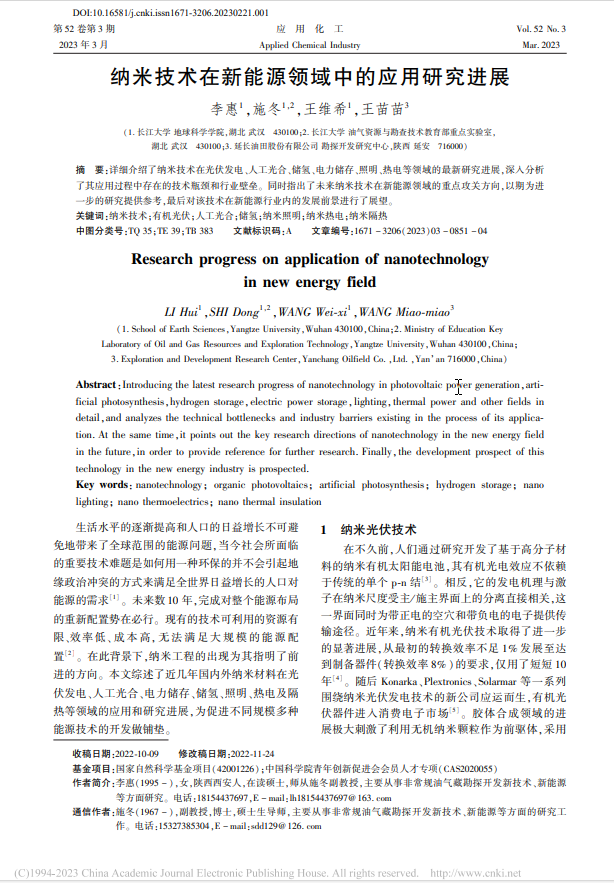 我院硕士生李惠在中文期刊《应用化工》上发表了题为“纳米技术在新能源领域中的应用研究进展”的研究论文。yl7703永利集团为论文第一署名单位,研究生李惠为论文第一作者,教师施冬为通讯作者。